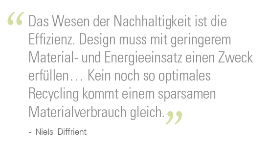 Niels Diffrient widmete sich dem einfachen und problemlos nutzbaren Design. Durch die Beschränkung der Komplexität seiner Entwürfe war Diffrient in der Lage, seinen Produkten durch geringeren Material- und Teileverbrauch eine höhere Nachhaltigkeit zu verleihen. Er war sich ständig des Einflusses seiner Produkte auf die Umwelt bewusst und kam zu der Feststellung: „Das Wesen der Nachhaltigkeit ist die Effizienz. Design muss mit geringerem Material- und Energieeinsatz einen Zweck perfekt erfüllen. Kein noch so optimales Recycling kommt einem sparsamen Materialverbrauch gleich.“